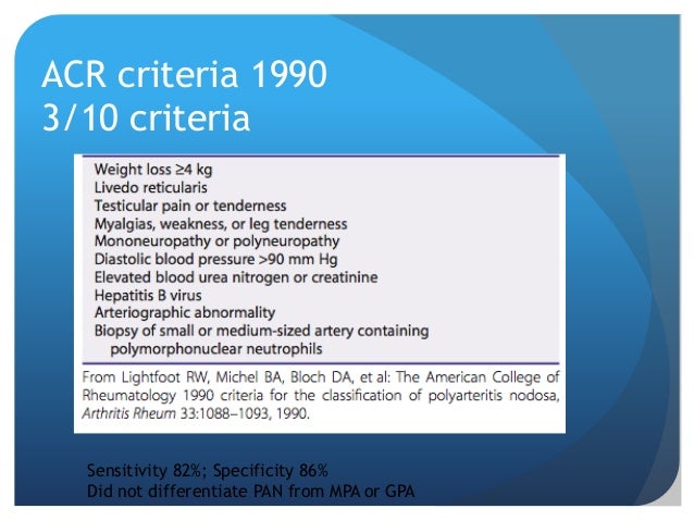 And polyarteritis nodosa (PAN) was recently proposed, which incorporates both the ACR classifi cation criteria and CHCC defi nitions (5). Isolated vasculitis of the peripheral nervous system M.P. Collins, M.I. Periquet. S-119 ... Access This Document