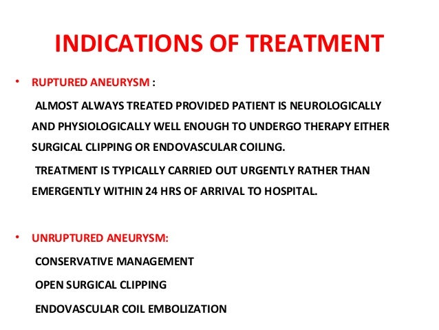 Treatment of Cerebral Aneurysms Endovascular or Surgical Treatment of Ruptured Aneurysms • Admit or transfer to hospital experienced in treatment of SAH • Diagnose source of SAH as soon as possible Endovascular Treatment of Aneurysms ... Document Retrieval